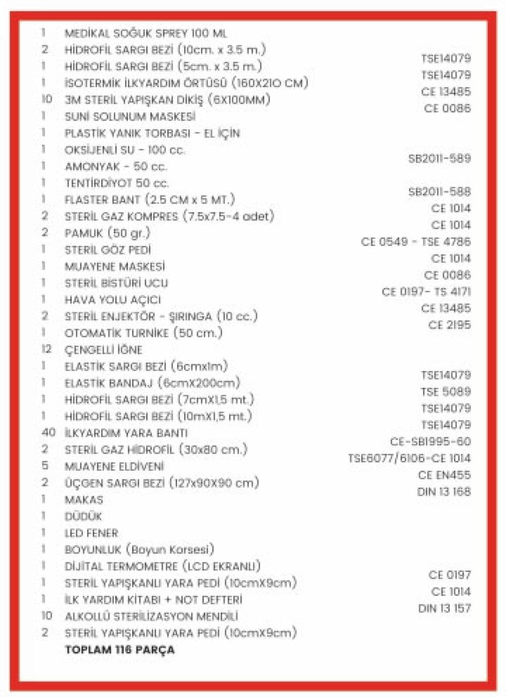 Muhteviyatında; Anında soğuk kompres, Dijital termometre, 3M Steri strip ( Steril yapışkan dikiş), Antiseptik, Oksijenli Su, Zehirli Balık/Böcek sokmasına karşı Amonyak, Bistüri ucu, Guadel Airway bulunmaktadır. Bunun dışında 8-10 kişiye kadar sargı bezi, yara bandı, gazlı bez, turnike, boyunluk,isotermik battaniye gibi ilk yardım malzemesi ihtiva eden özel kilitli şık kutusu içerisinde kullanışlı ve sağlam bir ilk yardım kitidir.