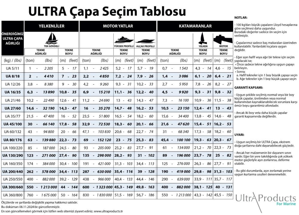 ULTRA Çapa bütün tekne tiplerine uygundur ve baş makaralarında sorunsuz çalışır. Standart olarak ULTRA Çapalar 5kg-360kg aralığında imal edilir. Daha büyük çapalar ise sipariş ile imal edilebilir.